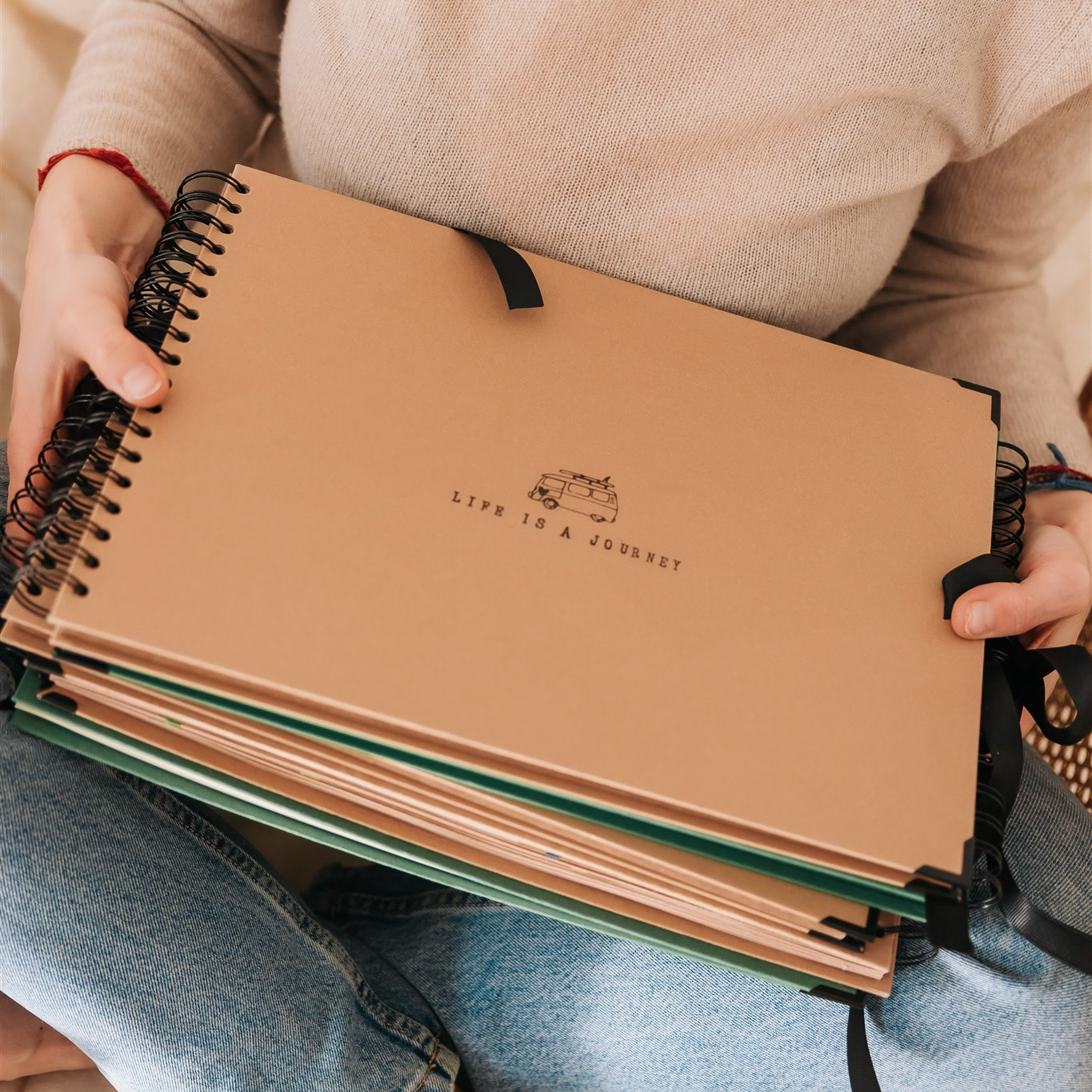 • Ręcznie stemplowana okładka z camperem i napisem Life is a journey