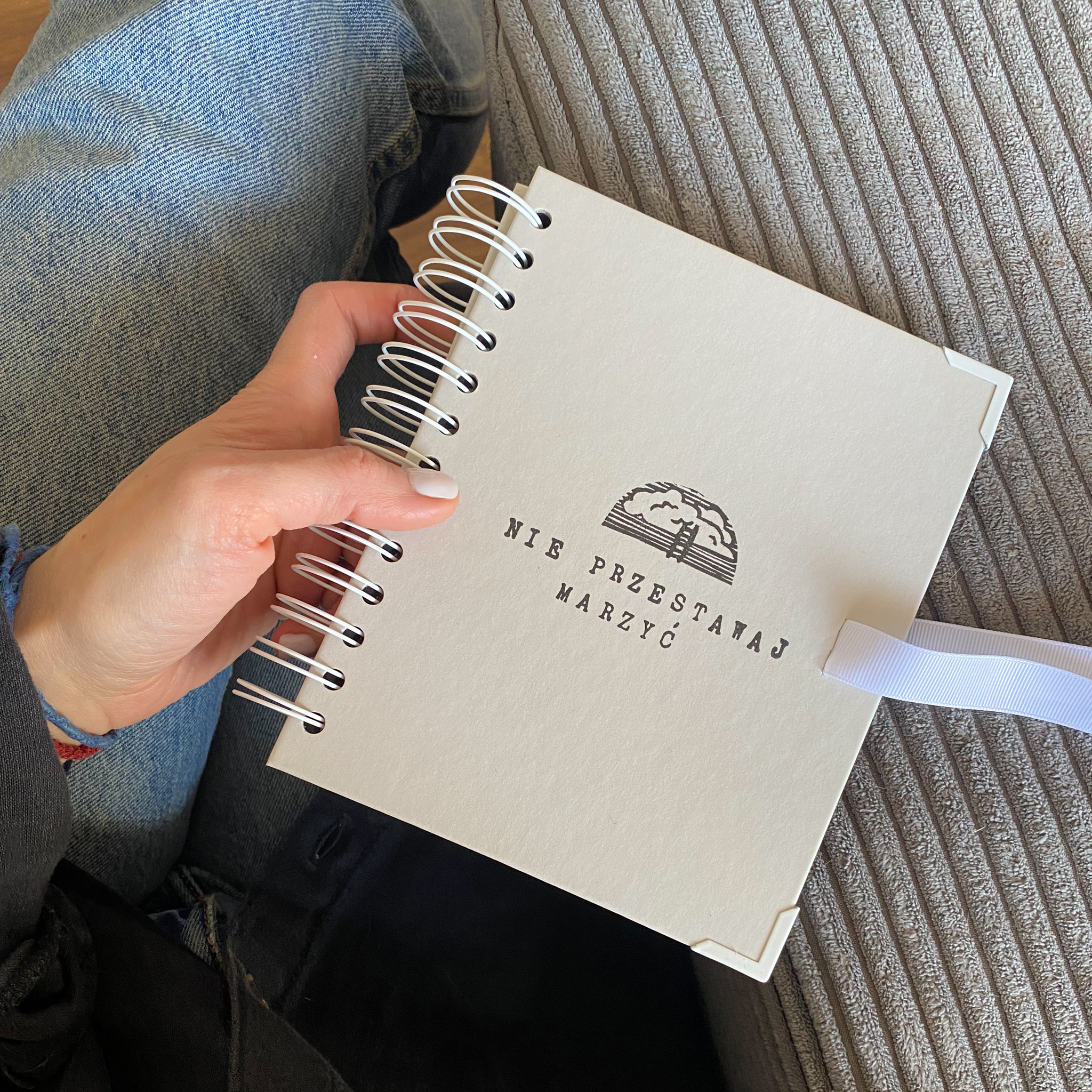• Ręcznie stemplowana okładka z grafika Marii Daszczuk i słowami Nie przestawaj marzyć