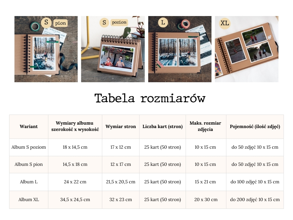 Albumy przyjmują różne rozmiary zdjęć – możesz mieszać formaty i wyklejać dwustronnie. Oto orientacyjna pojemność przy formacie 10×15 cm